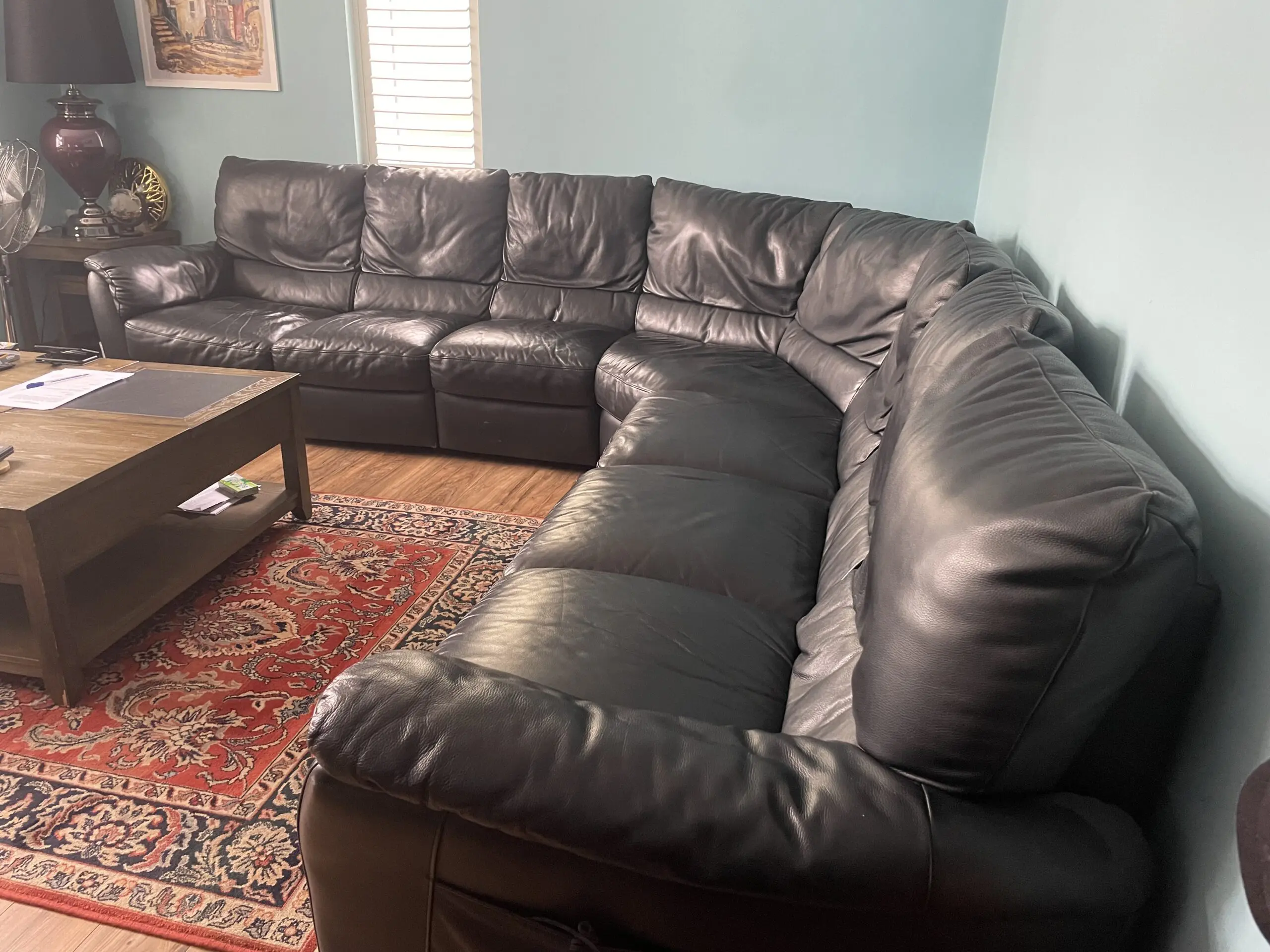 Large black leather corner sofa in very good condition. It can seat up to 8 people. The two seats on the edge recline up.