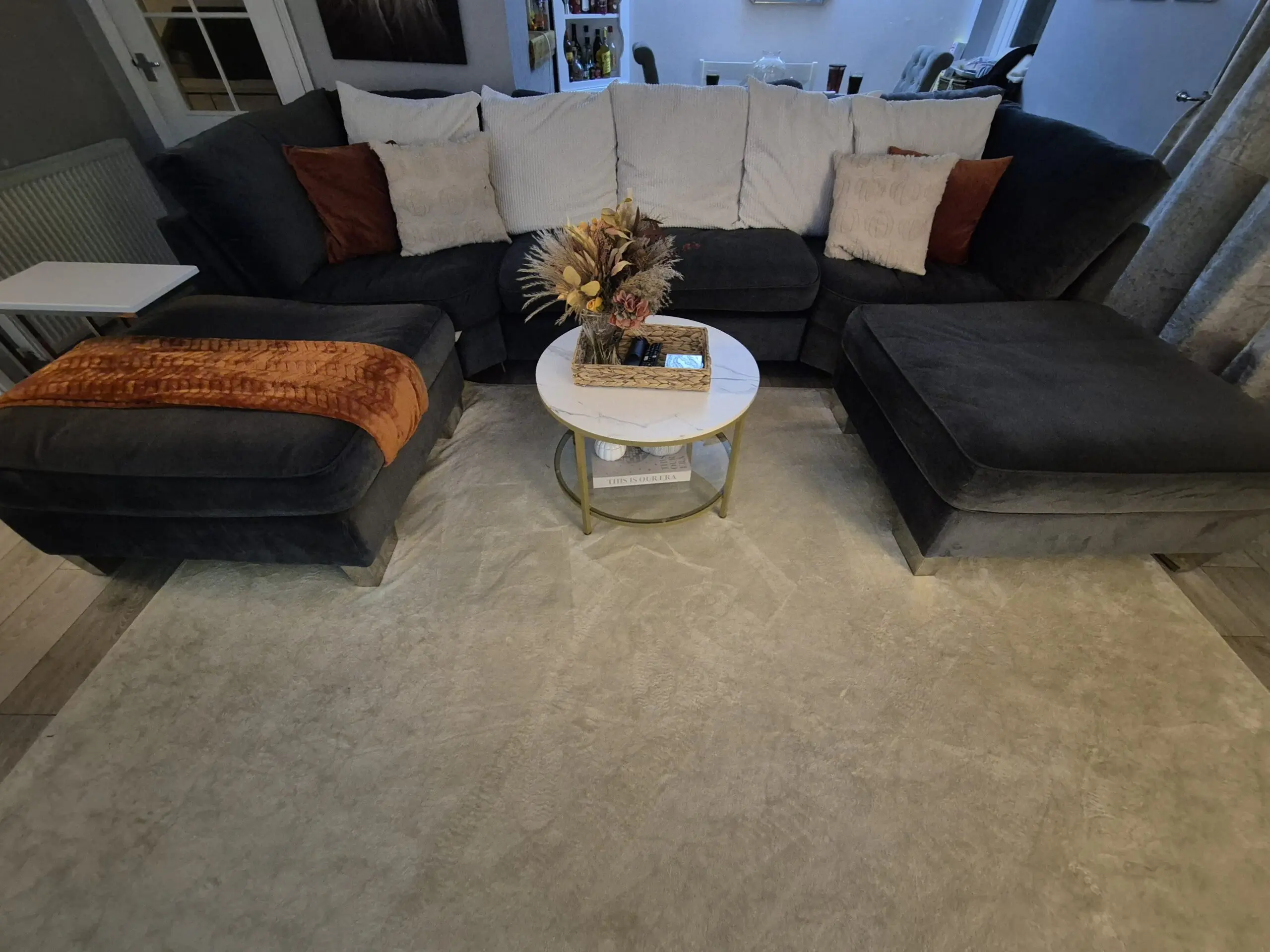 Beautiful soft material in excellent condition doesnt come with cream cushions or orange cushions it comes with original grey slate back cushions as shown in stock photo.