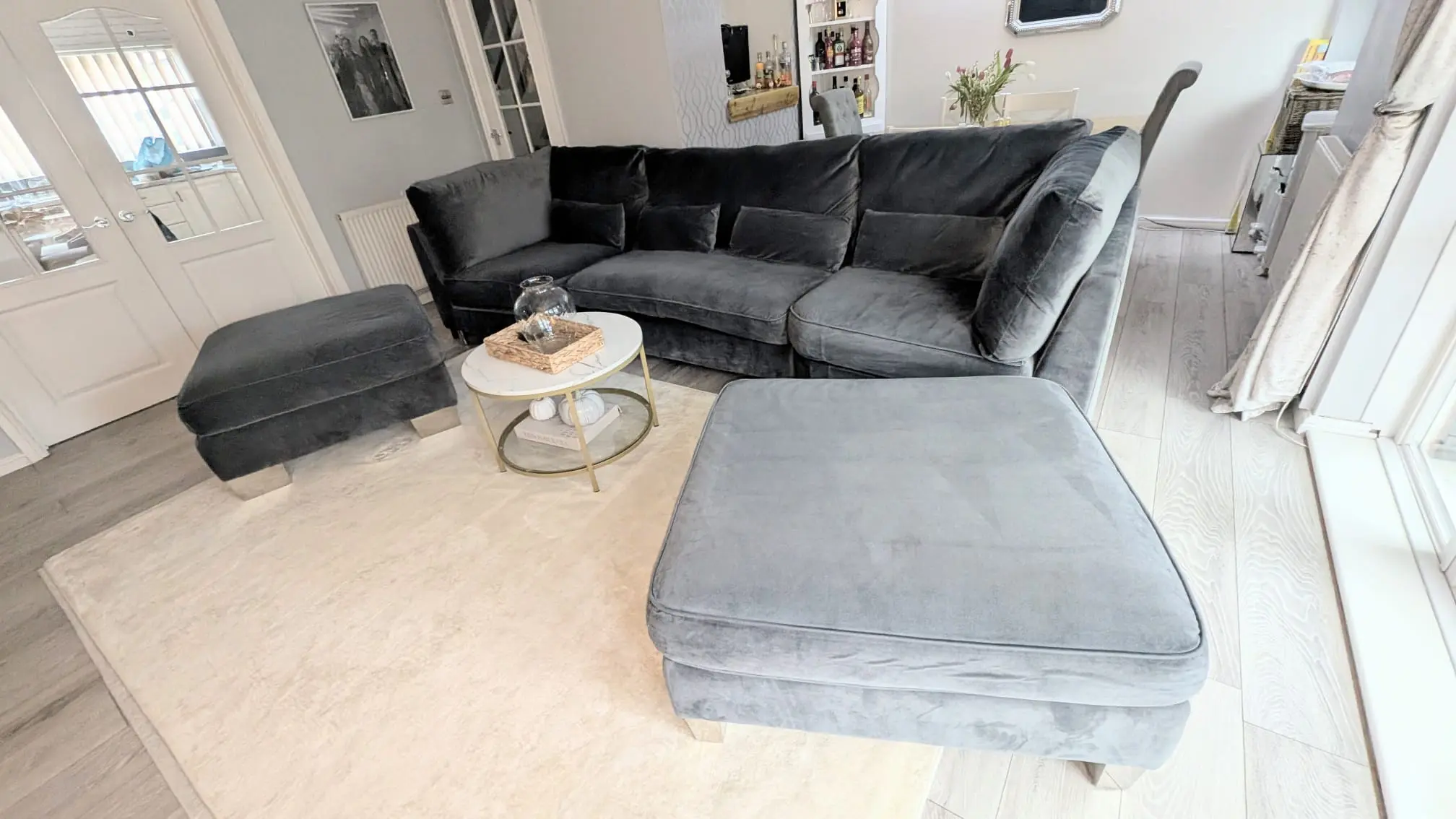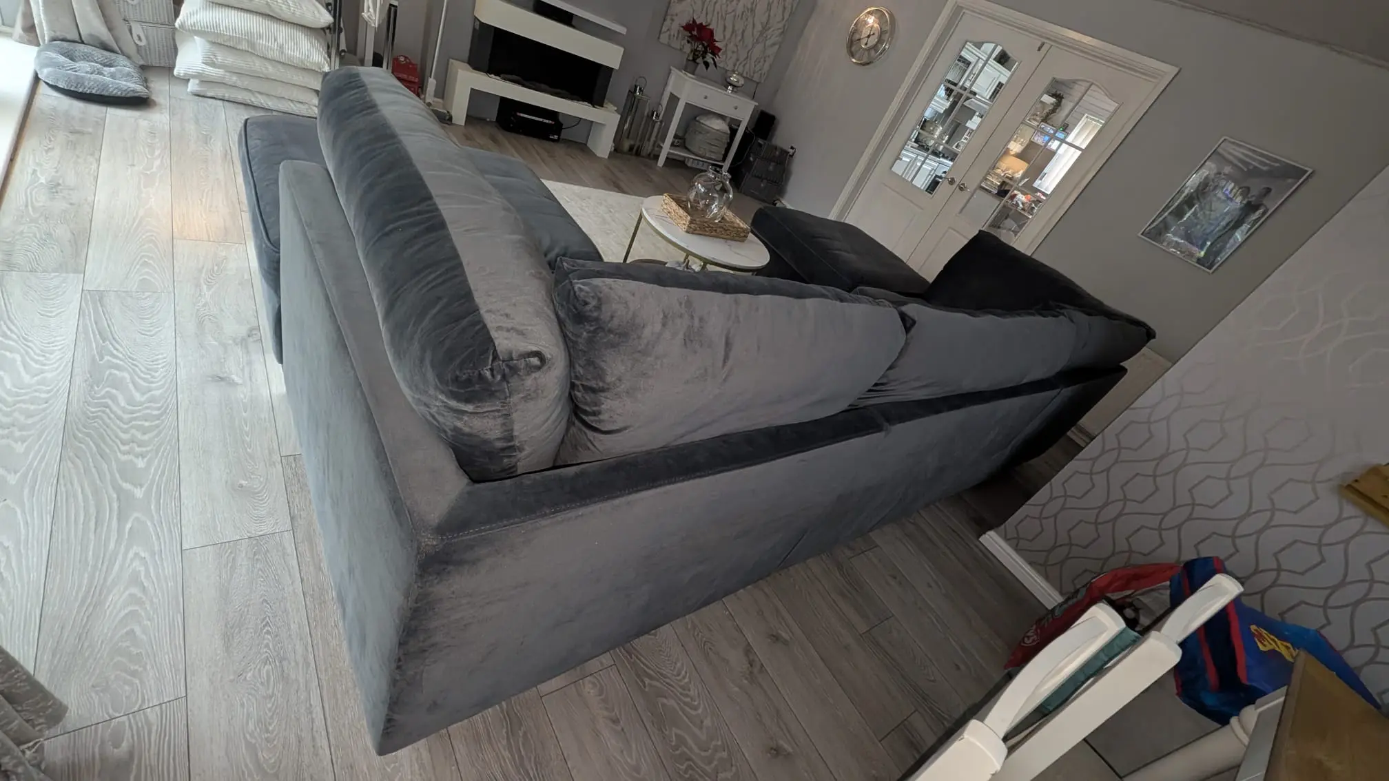Beautiful soft material in excellent condition it comes with original grey slate back cushions as shown in stock photo.
